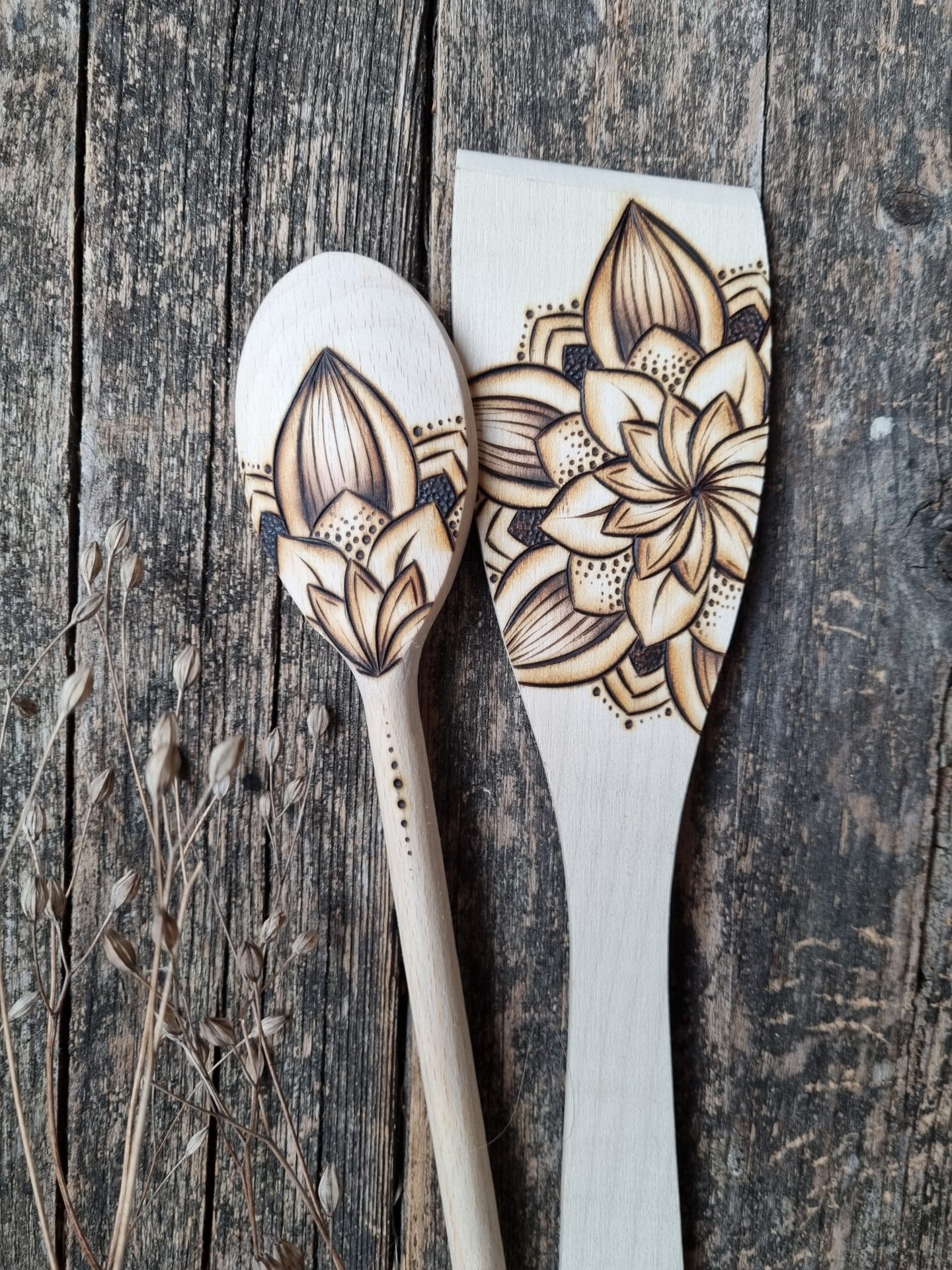 Handgebrannte Holzkellen Set mit einzigartigem Design für deine nachhaltige Küche. Inspiriert von der Natur und mit Leidenschaft gefertigt, sind diese kleinen Holzkunstwerke nicht nur schön anzusehen, sondern auch langlebig und praktisch im täglichen Gebrauch.“