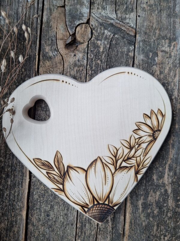 Starte deinen Tag mit einem Lächeln – dank meinem handgebrannten Frühstücksbrettchen im Herz Design! Die filigranen Motive bringen dir die Schönheit der Natur direkt nach Hause und verleihen deinem Frühstückstisch einen natürlichen Look.