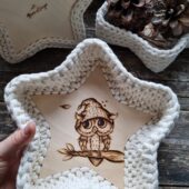 In meiner kleiner BrandLing-Stube entstehen Sternenkörbe, die eine besondere Geschichte erzählen: Mit einem warmen Weißton und einem zarten Goldfaden, liebevoll gehäkelt von Kathrin, umrahmen sie die Brandmalerei auf elegante und nostalgische Weise. Der Boden, gefertigt aus Schweizer Ahorn, bringt die Schönheit der Natur direkt in dein Zuhause.